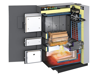 - Caldera de gasificación de leña con velocidad controlada del ventilador (solo 76 W) para un funcionamiento independiente del tiro de la chimenea.